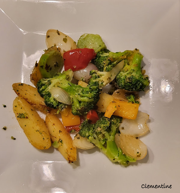 Mon choix s'est porté sur une omelette aux légumes et pommes de terre, mais une fois les légumes cuits et juste avant de leur incorporer les œufs, j'ai dit stop ! Je trouvais que la composition très colorée de légumes était trop jolie et je n'ai pas voulu gâcher l'esthétique en y ajoutant des œufs. Par contre comme il me restait un peu des légumes préparés j'en ai fait une omelette le lendemain.